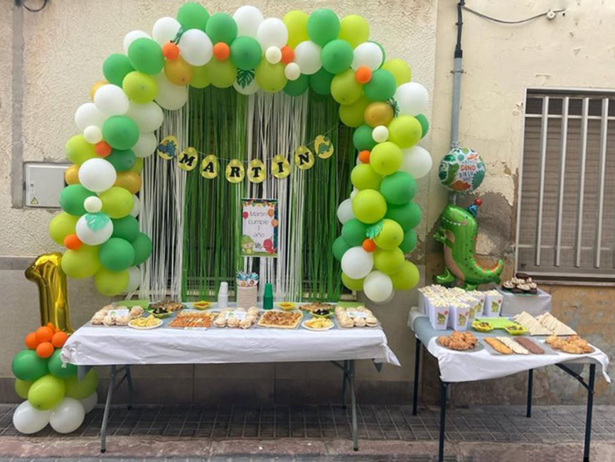 - Dinosaurios Protagonistas: Desde el gran dinosaurio de globos verde con gorro de fiesta hasta los pequeños detalles en cada rincón, la temática de dinosaurios está presente de forma divertida y adorable.