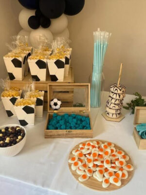 Transforma la fiesta de cumpleaños en un verdadero estadio con nuestra espectacular Mesa Dulce Temática Fútbol, inspirada en los colores de un equipo legendario. Ideal para los pequeños (y no tan pequeños) aficionados que sueñan con levantar la copa.