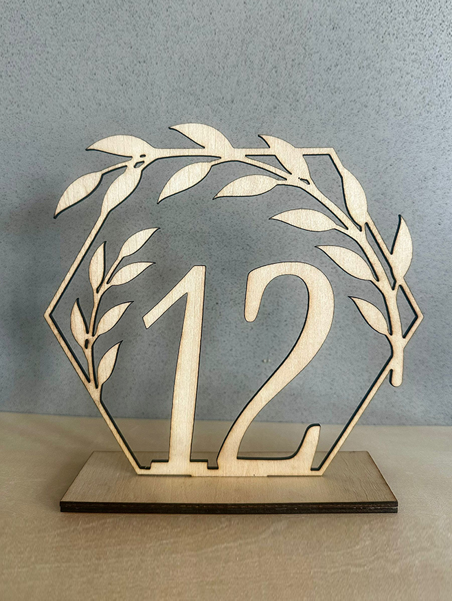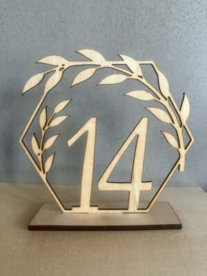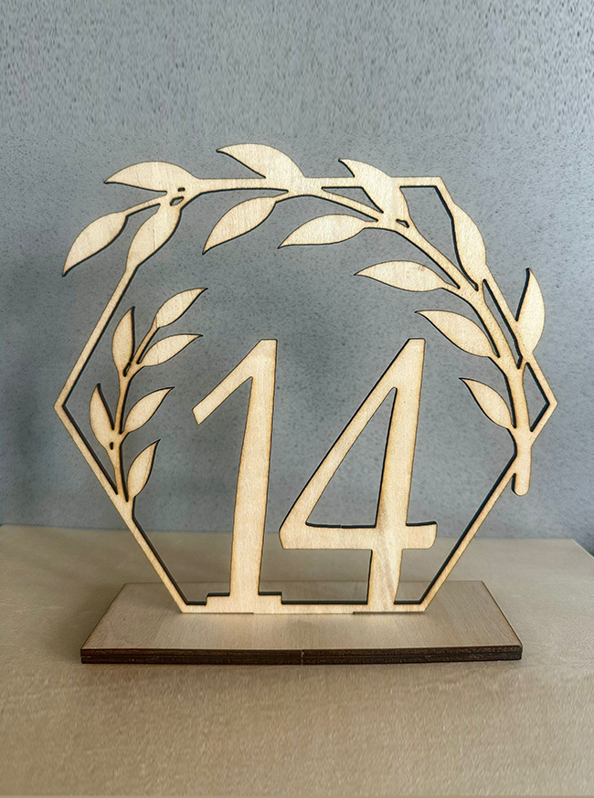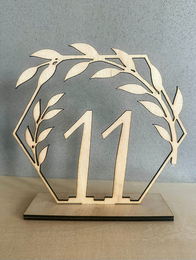 - Diseño: Número de mesa calado en hexágono con detalles botánicos.
